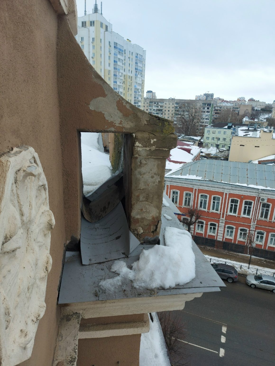 Ситуация с парапетами сложилась критическая. От постоянного намокания, перепадов температуры они разрушаются. В любой момент элементы конструкции могут упасть с крыши дома на улицу, где постоянно ходит множество людей, дети в том числе, – на первом этаже дома расположена областная детская библиотека. Жильцы дома неоднократно обращались в различные инстанции, чтобы были приняты меры по устранению протеканий и самое главное – устранению причин возможного разрушения парапетов на доме, иначе последствия могут быть самыми непредсказуемыми. И никто ни за что не отвечает. Управляющей компании плевать.