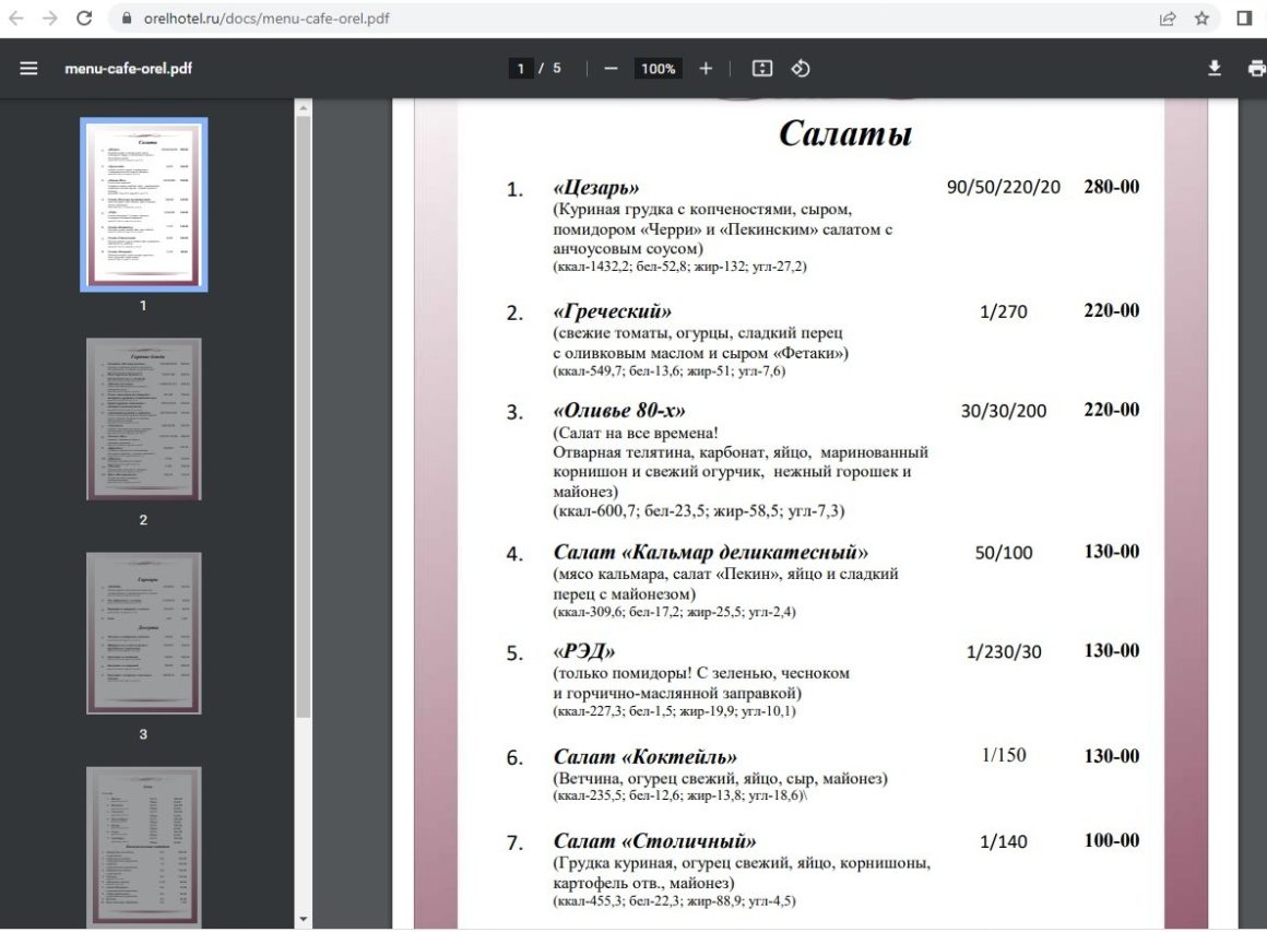 А теперь самое интересное. На официальном сайте «Орел-Отеля» размещена ссылка на меню того самого ресторана (кафе «Орелъ»), где в салат оливье кладут говядину. Судя по тому, что сайт является актуальным на сегодняшний день (номера бронируются на текущую дату), и ссылка на меню активна, то и само меню тоже можно считать актуальным. Так вот, в этом меню нет ни одного (!) блюда из говядины! Свинина есть, курица есть, даже баранина есть, а говядины – нет. И даже в составе пресловутого «Оливье» фигурирует не говядина, а телятина и карбонат (который, как известно, готовят из свинины).