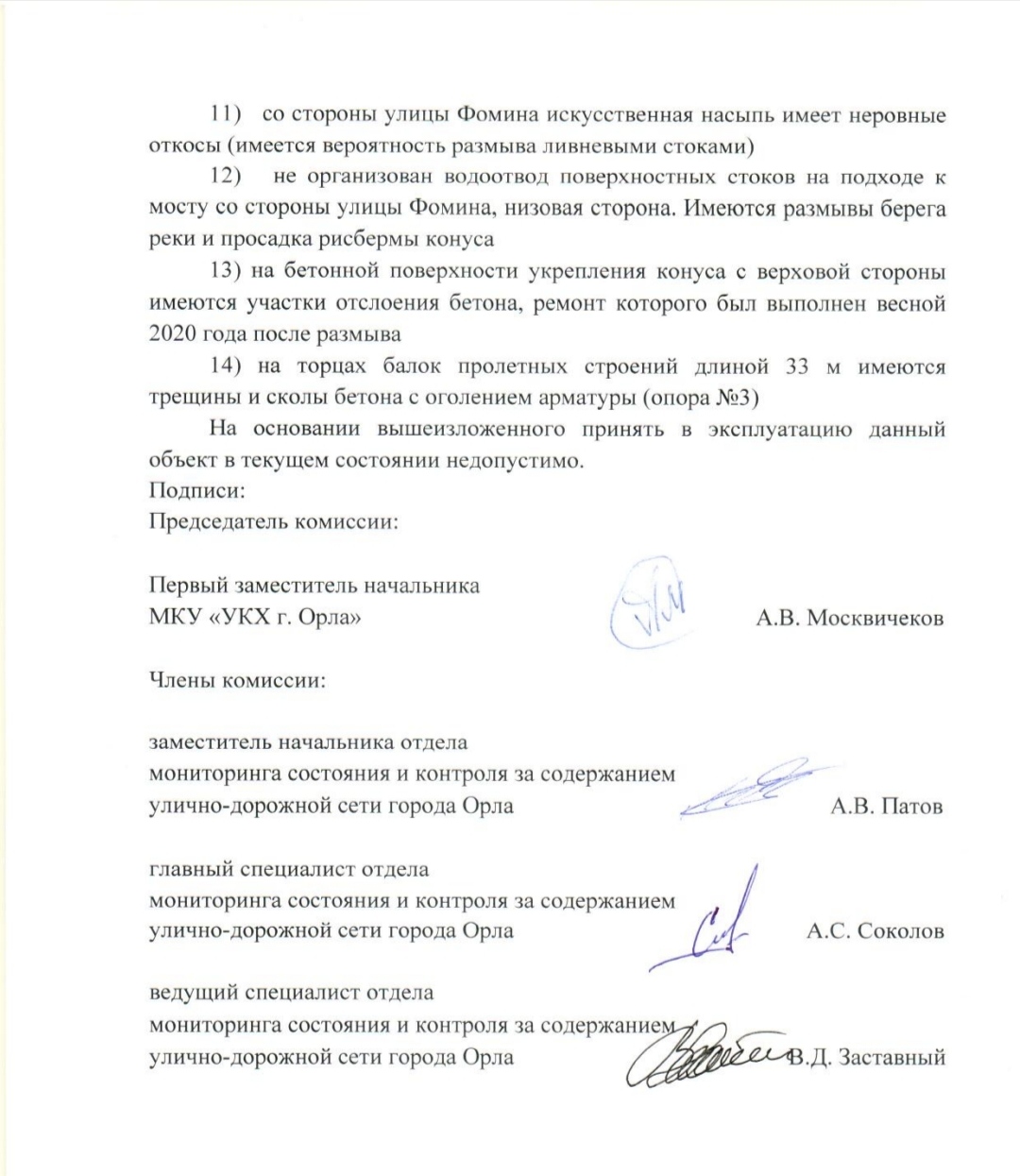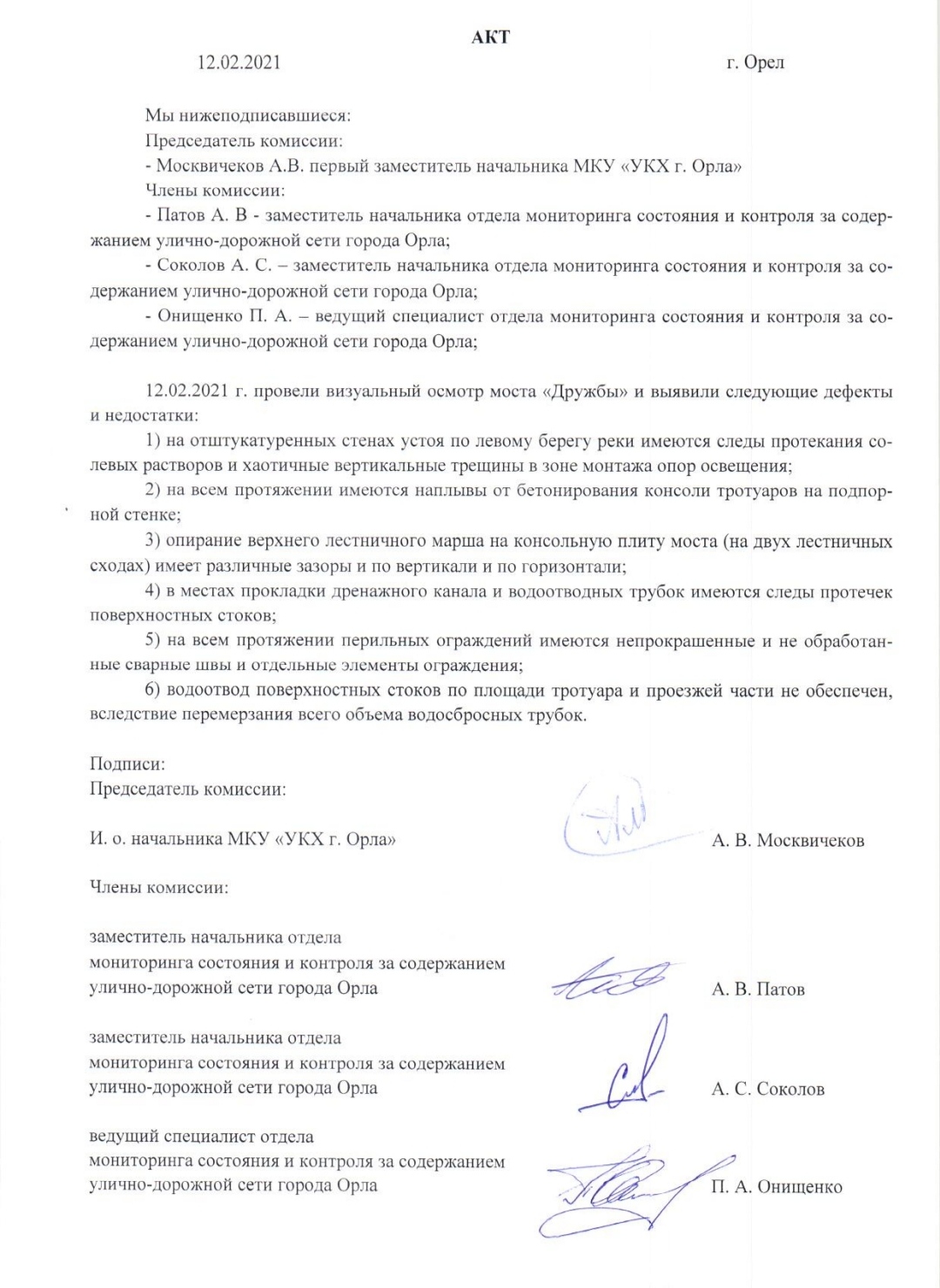 Показательный факт: все сотрудники, подписавшие публикуемые нами акты, были в качестве наказания за «строптивость» уволены с муниципальной службы. А сам процесс «приёмки» моста выглядел бы анекдотично, если бы последствия не оказались столь грустными. На разных страницах акта приёмки подписи мэра Орла оказались разными. А сам он никак не мог вспомнить, когда же он был на мосту «Дружба». В принципе, деятельность руководителя города достаточно основательно регламентирована. У него есть график, с которым знакомы его подчинённые, а официальные мероприятия мэра (а приёмка такого объекта – мероприятие официальное) всегда фиксируются. Но тут Юрий Парахин всё напрочь забыл.