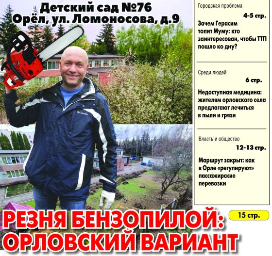 №14 (156) от 16 апреля 2025 г. В Орле продолжается операция «Лысый город»: на днях жертвами бензопил стали фруктовые деревья возле детского садика №76. Яблони и вишни, радовавшие жителей улицы…