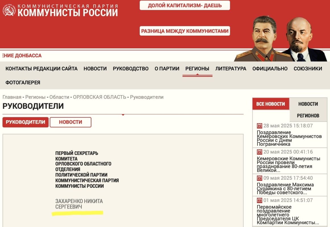 На сайте КПКР до сих пор первый секретарь Орловского обкома партии – Никита Захаренко