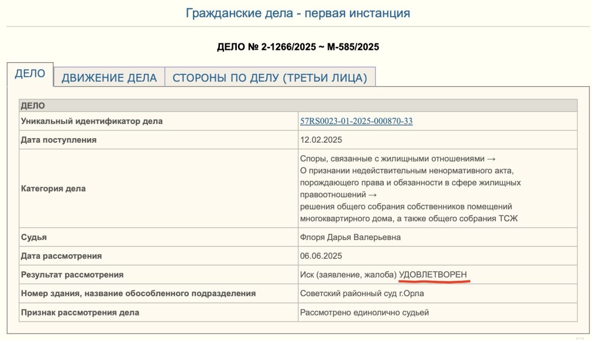 В феврале нынешнего года группа собственников помещений в ЖК «Крылья» обратилась в суд с иском о признании недействительными решений общего собрания ТСЖ, предусмотренных пунктами 1–11 протокола №1 внеочередного собрания собственников помещений многоквартирного дома № 66 А, корпус 1 по ул. Генерала Родина в г. Орле от 8.10.2024. В судебных заседаниях приводились многочисленные подтверждения того, что значительная часть собственников была лишена возможности проголосовать, а также того, что в любом случае для принятия решения о предоставлении УК «Крылья» права работать на объекте и устанавливать свои грабительские тарифы не было кворума. Процесс в Советском районном суде шёл без малого четыре месяца, и в конце концов иск о признании недействительным протокола №1 и решения о выборе УК «Крылья» для обслуживания упомянутого дома на ул. Генерала Родина был удовлетворён полностью.