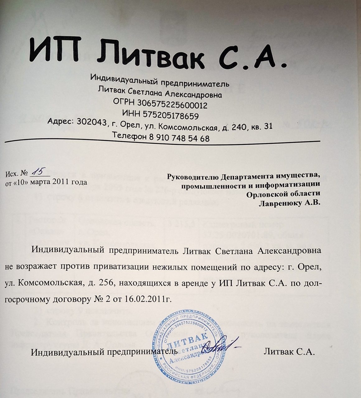 9 августа 2010 года выходит распоряжение Правительства Орловской области № 317-р о продаже без объявления цены «нежилого помещения