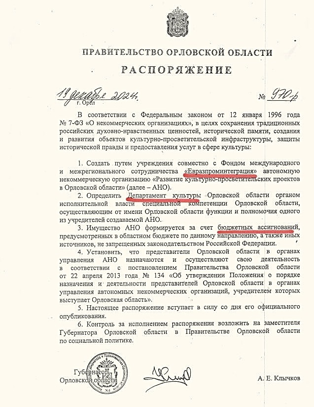 19 декабря 2024 г. Андрей Клычков подписывает распоряжение о создании автономной некоммерческой организации (АНО) «Развитие культурно-просветительских проектов в Орловской области». В качестве учредителей определены департамент культуры Орловской области и фонд «Евразпроминтеграция».