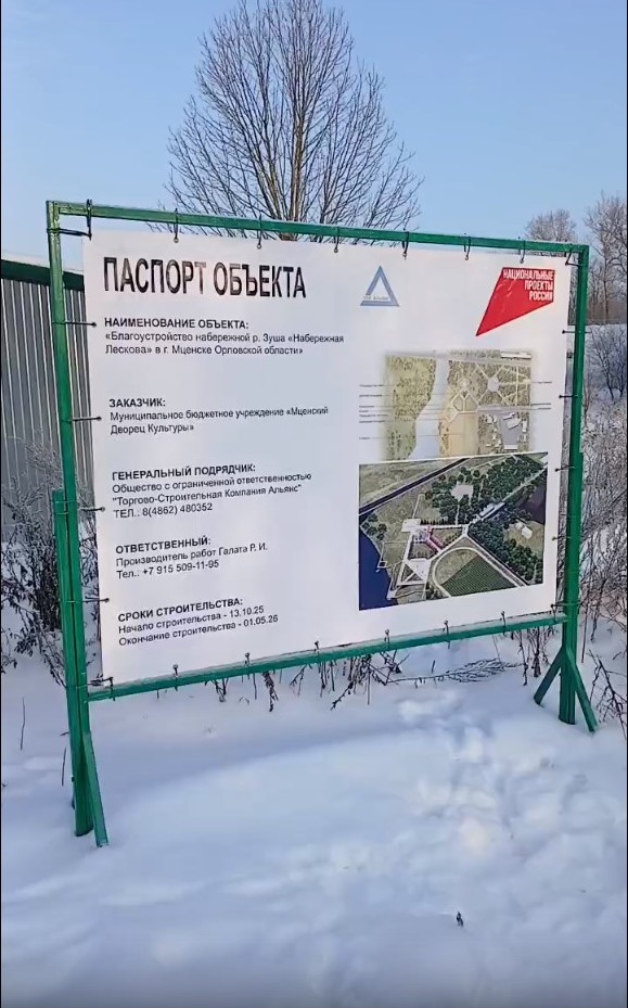 Видео набережной в январе 2026 года в редакцию «ОС» прислал житель Мценска Александр Коробов. Как видно из паспорта объекта, подрядчик сменился, сейчас это «Торгово-Строительная Компания Альянс», а вот заказчик все тот же – Мценский ДК…