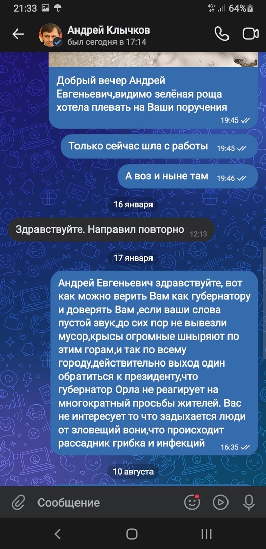 – Почему Клычков не хочет заниматься этим вопросом? Но на всех плясках и форумах он находит время для участия. Или ждёт финансовых потоков от федералов для ликвидации мусорных свалок на Орловщине?