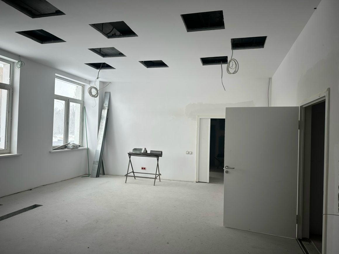 – «Стрела» сегодня своими силами выполняет работы по завершению строительства объекта… На объекте трудятся двести человек, работы ведутся на всех этажах здания, на первом этаже акцент сделан, там работы близятся к завершению, завершен монтаж системы ГВС… пожарной сигнализации. Каждый этаж разделён на блоки. На сегодня первый блок – чистовая отделка, и подрядчик переходит на чистовую отделку второго и третьего блоков. Параллельно по остальным этажам ведётся монтаж системы вентиляции слаботочной системы, канализации, холодного и горячего водоснабжения. Планируемый срок завершения работ – конец июля 2026 года. В здании девять функциональных этажей.