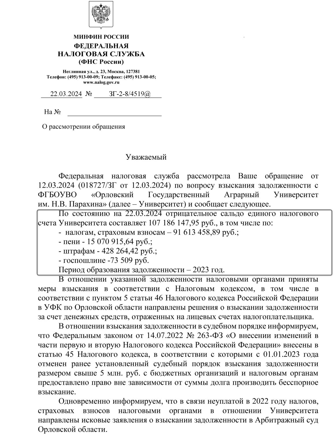 На сайте Федресурса появилось прелюбопытное объявление: «ООО Парус+»… сообщает о своём намерении обратиться в арбитражный суд с заявлением о признании Федерального государственного бюджетного образовательного учреждения высшего образования «Орловский государственный аграрный университет им. Н.В. Парахина» несостоятельным (банкротом) в связи с вступлением в законную силу решения Арбитражного суда Орловской области от 02.10 2023 года…». Для понимания далёких от бизнеса читателей: Федресурс – это Единый федеральный реестр юридически значимых сведений о фактах деятельности юридических лиц, индивидуальных предпринимателей и иных субъектов экономической деятельности. А «прелюбопытное» – самое мягкое слово, которое здесь можно употребить. Государственный вуз может стать банкротом? С внешним управлением, с конкурсным управляющим? Вы такое можете себе представить?