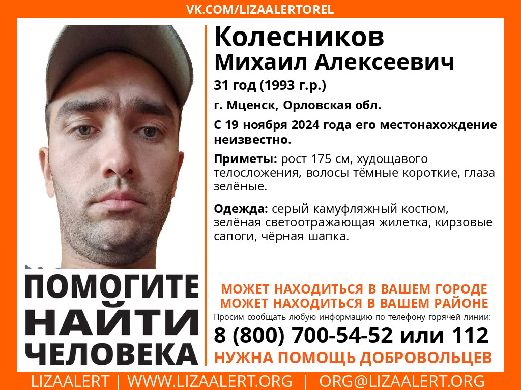 В Орловской области продолжается поиск пропавшего 19 ноября мужчины. В связи с этим поисковики просят всех, кто двигался на автомобиле 19.11.2024 г. около 19:00 по г. Мценску (ул. Привокзальная – ул. Андрея Рева – ул. Мира) и проезжал в сторону д. Глазуново, д. Фроловка или двигался мимо этих населенных пунктов около 00:00 (с 19 на 20 ноября) , предоставить видеозаписи с автомобильных регистраторов.