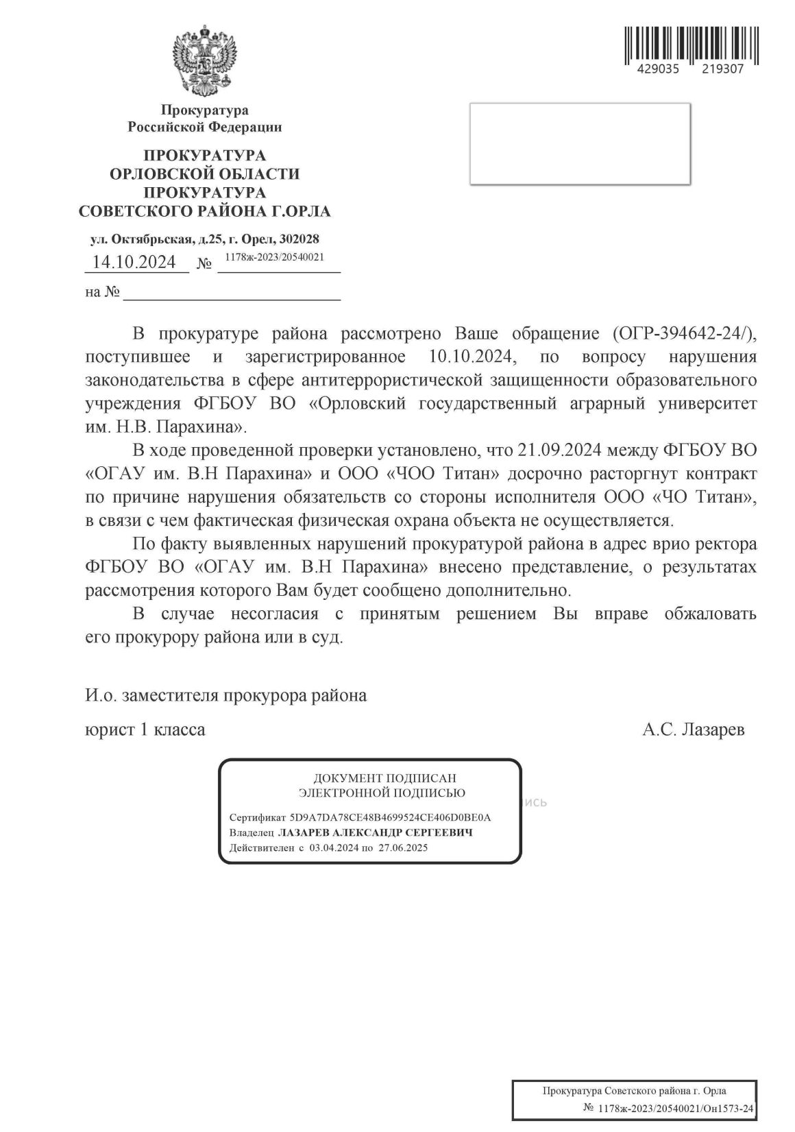 «В ходе проведенной проверки установлено, что 21.09.2024 между ФГБОУ ВО «ОГАУ им. Н.В. Парахина» и ООО «ЧОО Титан» досрочно расторгнут контракт по причине нарушения обязательств со стороны исполнителя ООО «ЧОО Титан», в связи с чем фактическая физическая охрана объекта не осуществляется». Прокуратура Советского района также сообщает, что в адрес врио ректора ОГАУ внесено представление по факту выявленных нарушений. Ответ прокуратуры датирован 14 октября.