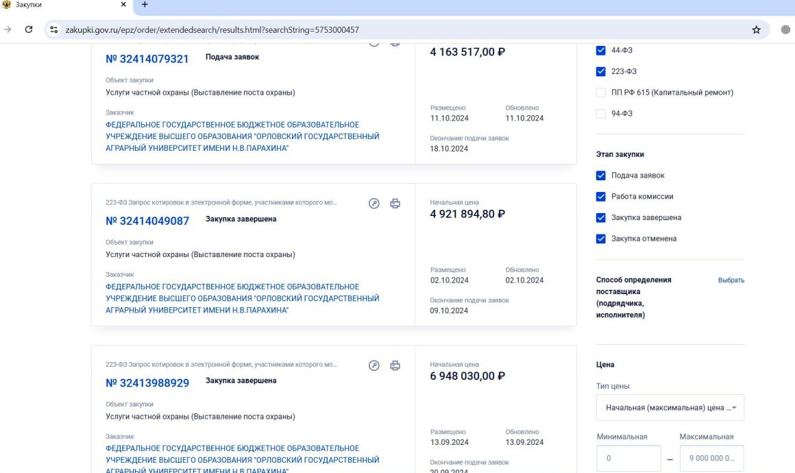 При этом, согласно информации сайта госзакупок, контракт на охрану вуза не заключен до сих пор. Две закупки на услуги частной охраны, объявленные ОГАУ в сентябре и в начале октября, признаны несостоявшимися. Причем, если по одной закупке все заявки были отклонены, то по второй – никто не заявился, что наводит на мысли, что желающих работать с аграрным университетом не имеется. Третья закупка, размешенная 11 октября, находится в стадии подачи заявок, которые принимаются до 18 октября.