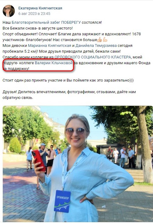 Она же, если верить госпоже Княгнитской, является и ее, госпожи Княгнитской, «подругой-коллегой». И это, похоже, чистая правда. Ибо госпожа Княгнитская наряду с госпожой Клычковой принимает самое деятельное участие в организации ежегодных благотворительных забегов «По берегу», вместе с губернаторшей ездит в различные поездки, участвует в мероприятиях и награждениях, и даже гуманитарную помощь в зону СВО они возили вместе. Причем вместе с ныне арестованным советником Лежневым.