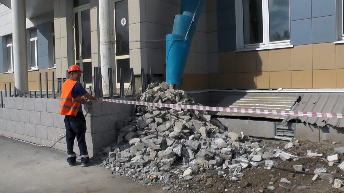 В спортивном и актовом залах только заканчивают черновые работы, а вот претензии к качеству уже есть. На здании школы все технические лестницы плохо закреплены, они «играют», тем самым разрушая штукатурку фасада.
