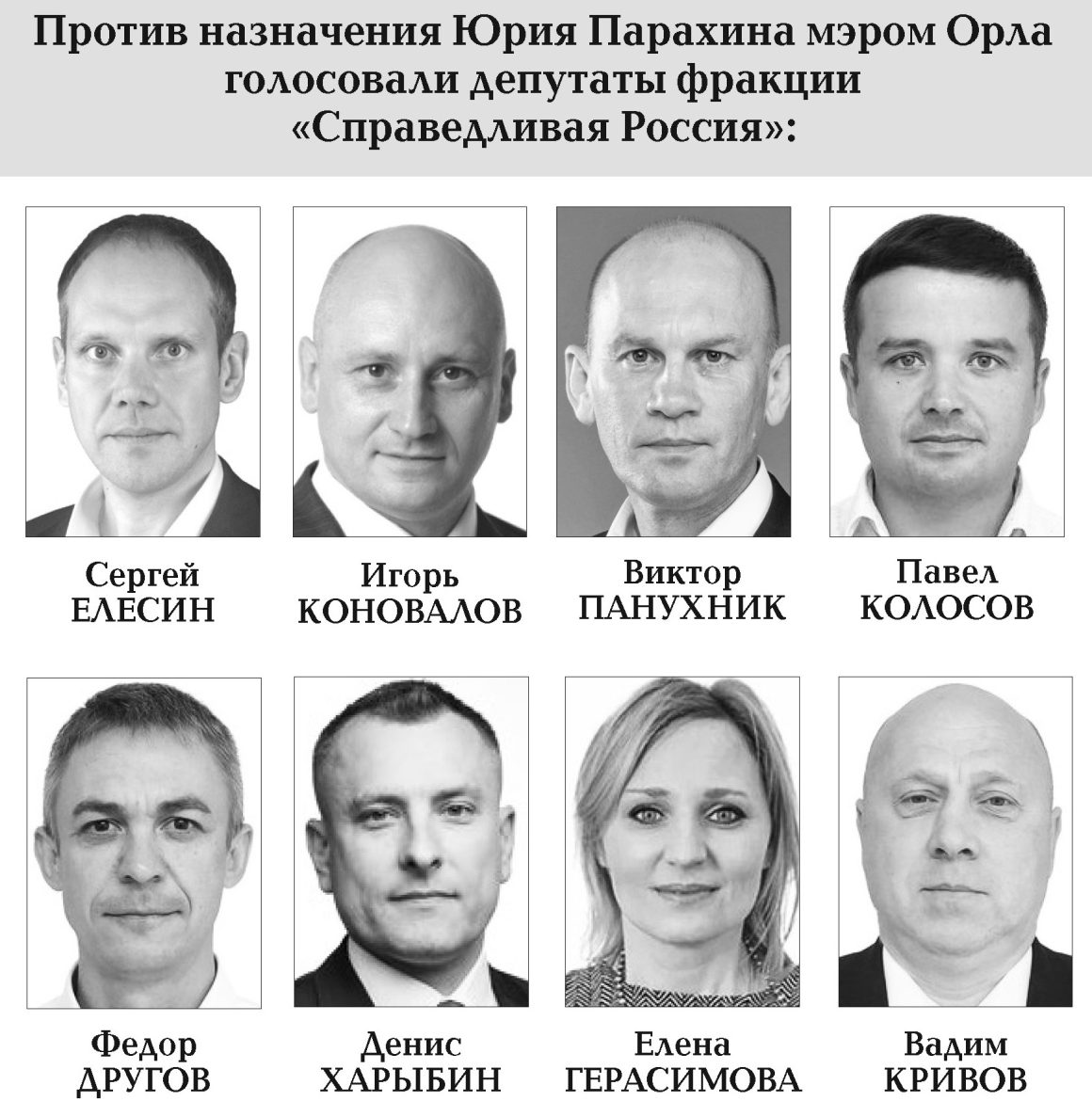 На самом деле никакой тайны здесь нет – «справедливороссы» еще до начала процедуры голосования заявили о своей принципиальной позиции. Но поскольку рядовые граждане Орла на сессии горсовета присутствовать не могли, а официальные ресурсы постеснялись назвать не то чтобы имена, а хотя бы название фракции, отказавшей Парахину в доверии, мы восполним информационный пробел. Потому что считаем: жители Орла, совсем недавно избравшие депутатов горсовета, должны знать, кто действует в их интересах, а кто воспользовался их голосами, чтобы продвигать интересы совсем других людей