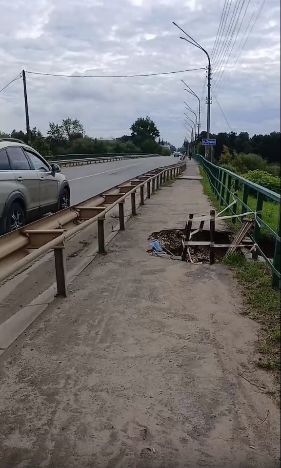 Длину и ширину ямы я измерил рулеткой. Длина ямы составила более 2,5 метра, ширина ямы составила более 1,6 метра. Толщина асфальта на тротуаре составила четыре сантиметра (!). Все ливневки на данном мосту забиты грязью, там выросла трава. Данная ситуация может привести к трагическим событиям, дети с 1 сентября будут ходить в школы! Прошу направить по этому адресу соответствующие организации для фиксации данной ямы на тротуаре и принятия мер для ее устранения в срочном порядке!