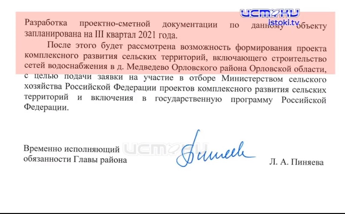 «Центральный водопровод жителям деревне Медведево обещают давно. В апреле этого года администрация Орловского района заявила о начале проектных изысканий. После этого, пишут чиновники, возможно, деревня попадет в национальный проект. Жители таким обещаниям не верят», – уточнили «Истоки».